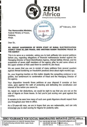 This is to serve as a reminder, asking you to look seflessly into several petitions before you, regarding allegations of financial malfeasances levelled against the Managing Director of Rural Electrification Agency, Ahmad Salihijo Ahmad, and his suspension of seven staff members of the agency after he and some others at the upper echelon of REA used them to commit N1.2bn fraud.